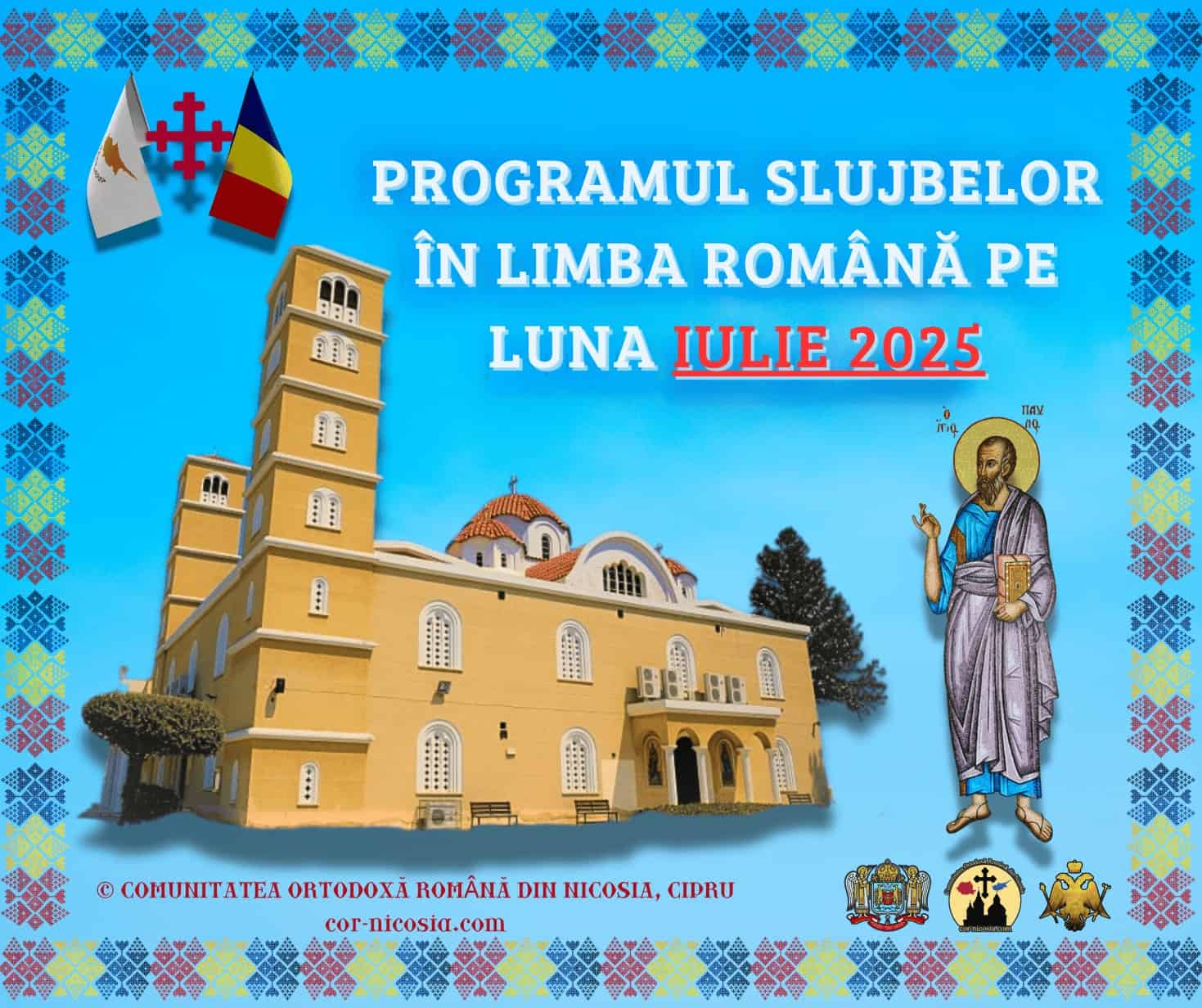 Duminică, 6 Iulie, ora 10:00 – Sfânta Liturghie, la biserica „Sfântul Pavel”. Notă: În perioada 7 – 30 Iulie a.c., Pr. Petre Matei va lipsi