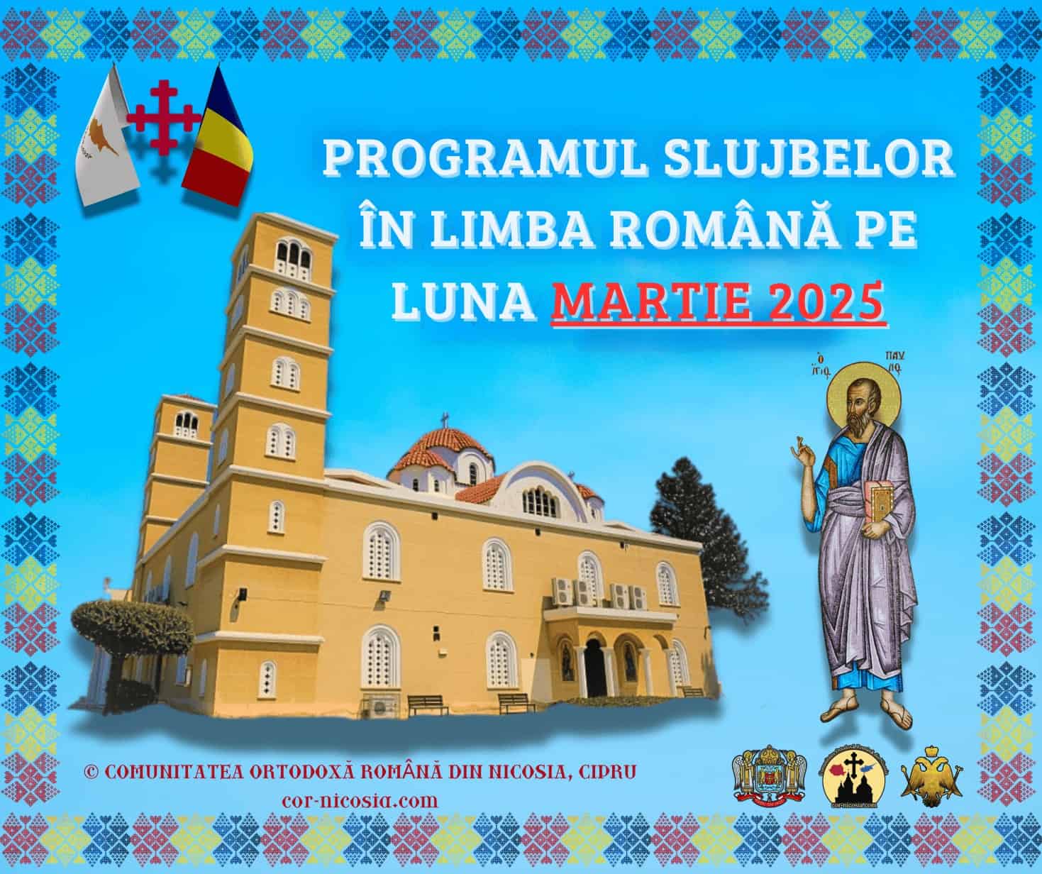 Duminică, 6 Aprilie, ora 10:00 – Sfântul Maslu, la biserica „Sfântul Pavel”. Duminică, 13 Aprilie, ora 10:00 – Floriile – Sfânta Liturghie, la biserica „Sfântul